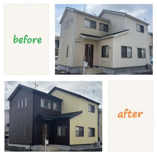 外壁のツートンカラーも素敵です☺️✨/外壁塗装/カラー/色決め 2025年09月26日(金) .。・.。*゚>。。.。・.。*゚>。。.。・.。*゚>。。.。・.。*゚>。。.。・.。*゚ スタッフブログをご覧いただきありがとうございます。 古河市、野木町を中心に塗装工・・・