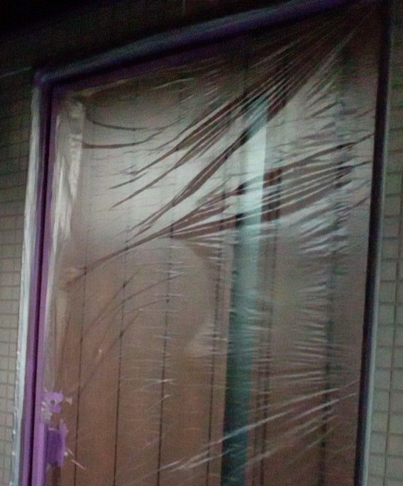 玄関周辺は玄関ドア・ノブだけでなく、床の養生も必要です。床の通路などは滑りにくいノンスリップマスカーを使用します。厚みがあり丈夫なブルーシートを使う場合もありますが、いずれもシートの端をテープでズレないように固定します。