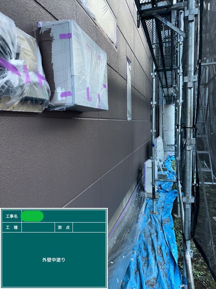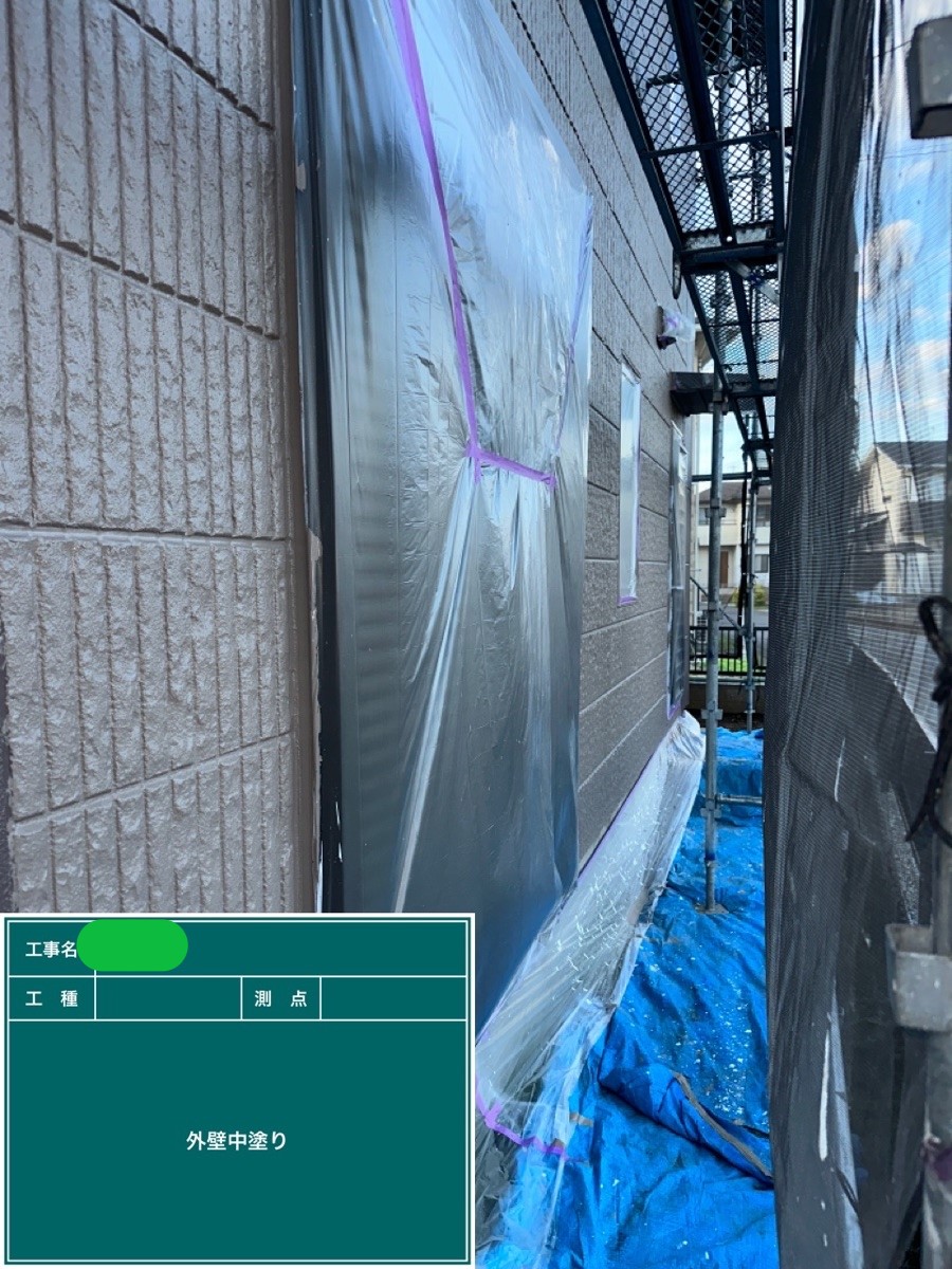 外壁中塗り 中塗り施工の段階で凸凹等のない平らでなめらかな下地を作っておくことで上塗りがキレイに塗れるため、より美しく仕上げる事が出来ます!