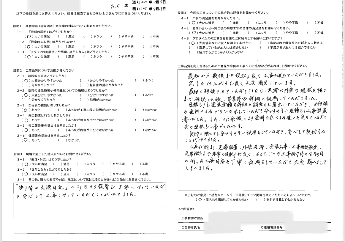 ・「塗り替え交換日記」により日々の報告も丁寧にやっていただき安心して工事をやっていただくことができました。
