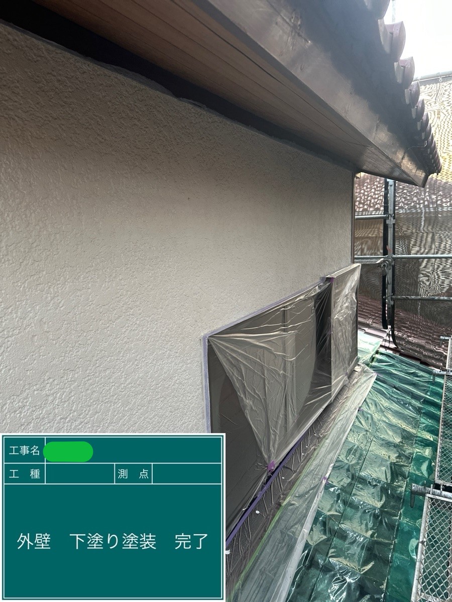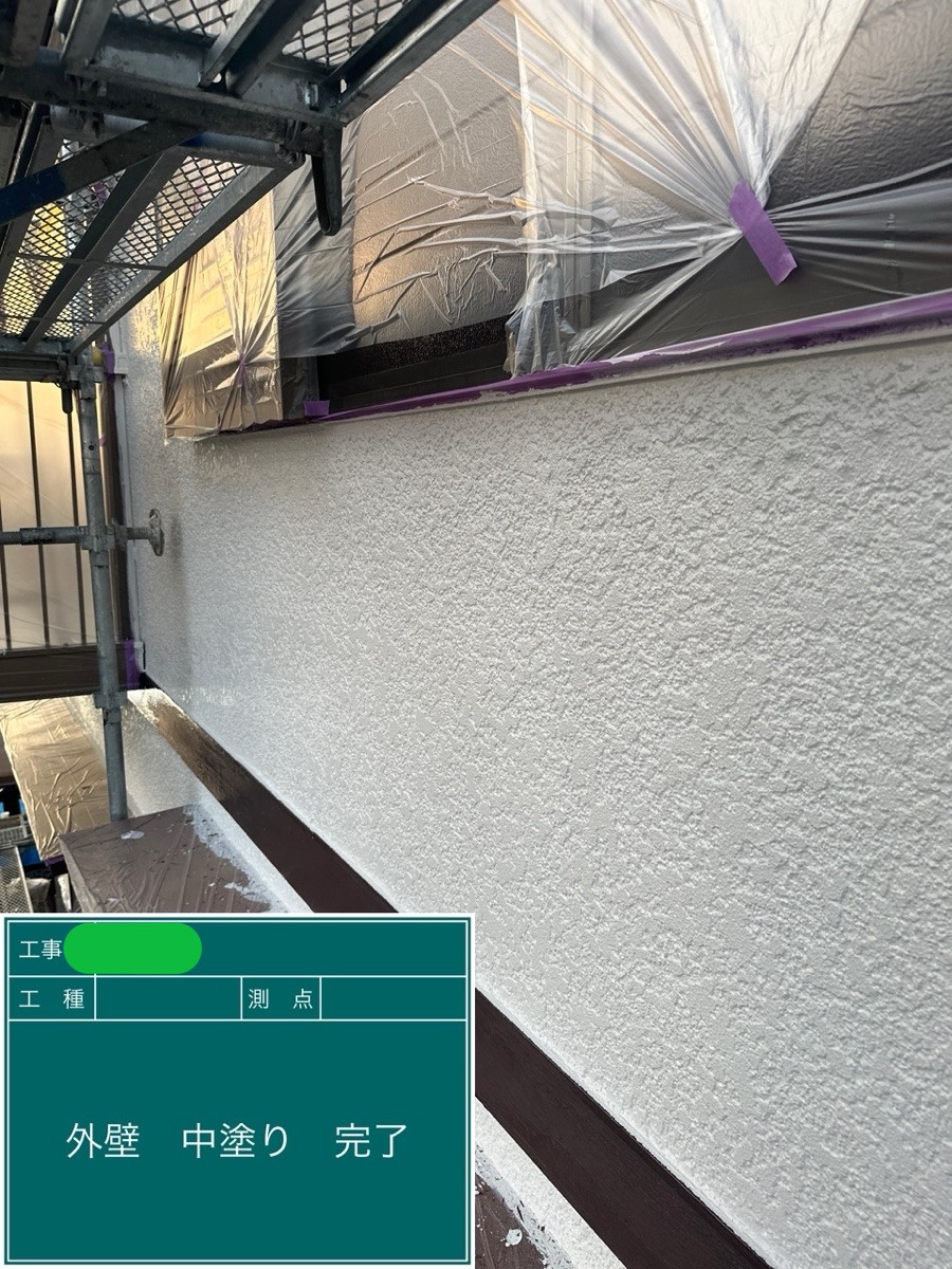 外壁中塗り施工 中塗り➡上塗りと2回に分けて塗装する事で性能を耐久年数の間しっかり持続させるために中塗りの塗装が必須です。