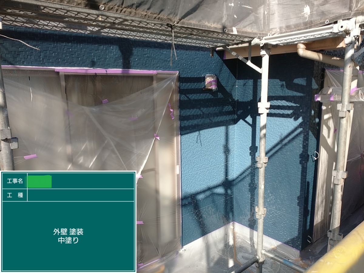 外壁中塗り 中塗り➡上塗りと2回に分けて塗装する事で性能を耐久年数の間しっかり持続させるために中塗りの塗装が必須です。