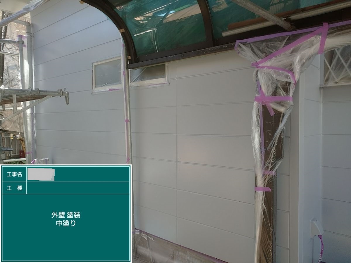 外壁中塗り 中塗り➡上塗りと2回に分けて塗装する事で性能を耐久年数の間しっかり持続させるために中塗りの塗装が必須です。