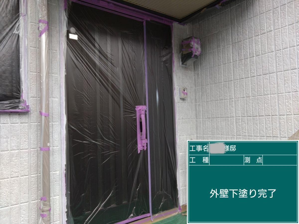 外壁の下塗りを行いました。外壁材と中塗り上塗り塗料との密着力を強め防水性と耐候性に優れた塗膜を作り出します!