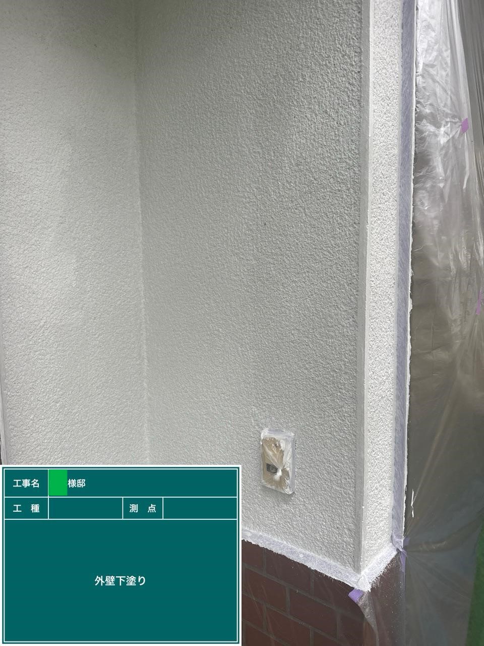 外壁の下塗りを行いました。外壁材と中塗り上塗り塗料との密着力を強め防水性と耐候性に優れた塗膜を作り出します!