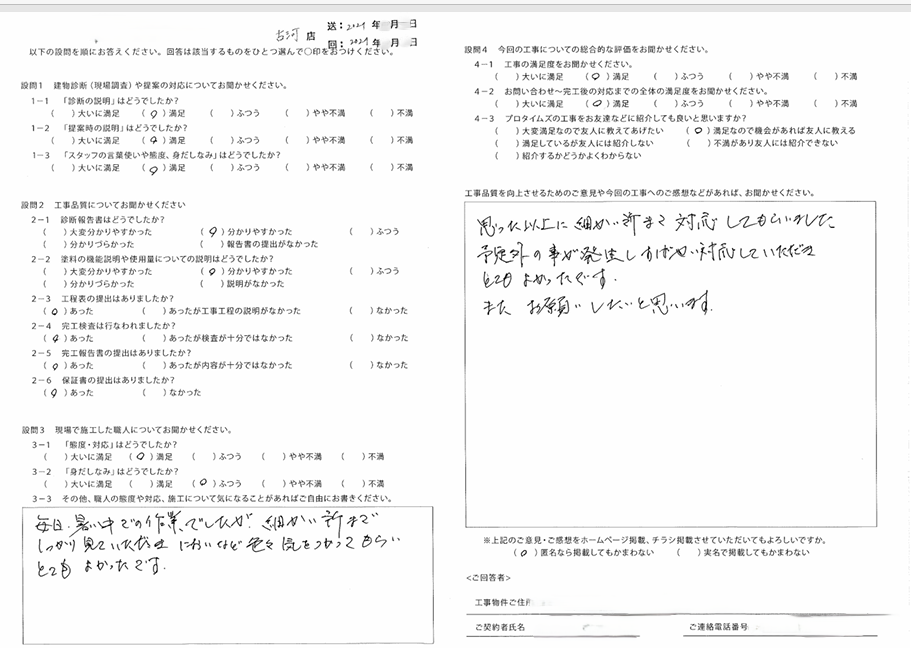 毎日暑い中での作業でしたが、細かいところまでしっかりと見ていただき、匂いなども色々気を遣っていただき、とてもよかったです。