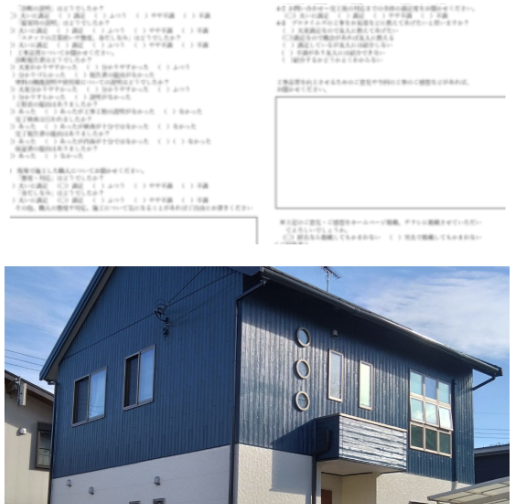 | 使用塗料 | 屋根/日本ペイント/ファインパーフェクトセラミックベスト ディープグレー 外壁/アステックペイント/超低汚染プラチナリファイン2000Si-IR 上部8108(マウンテンブルー)、下部8091(ブロークンホワイト) |