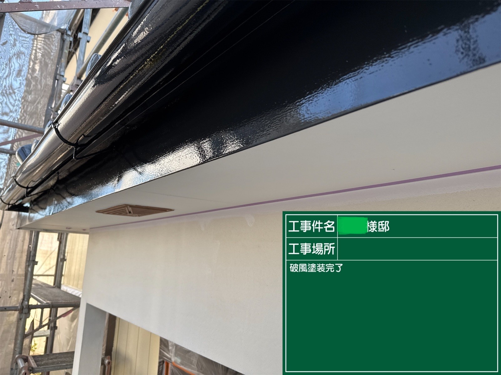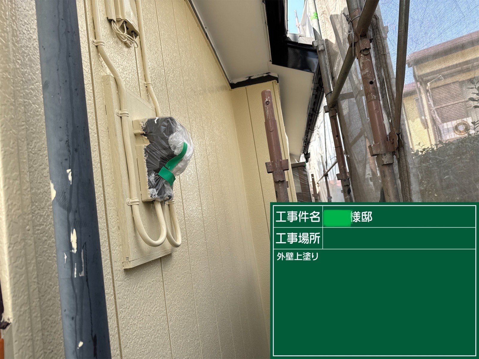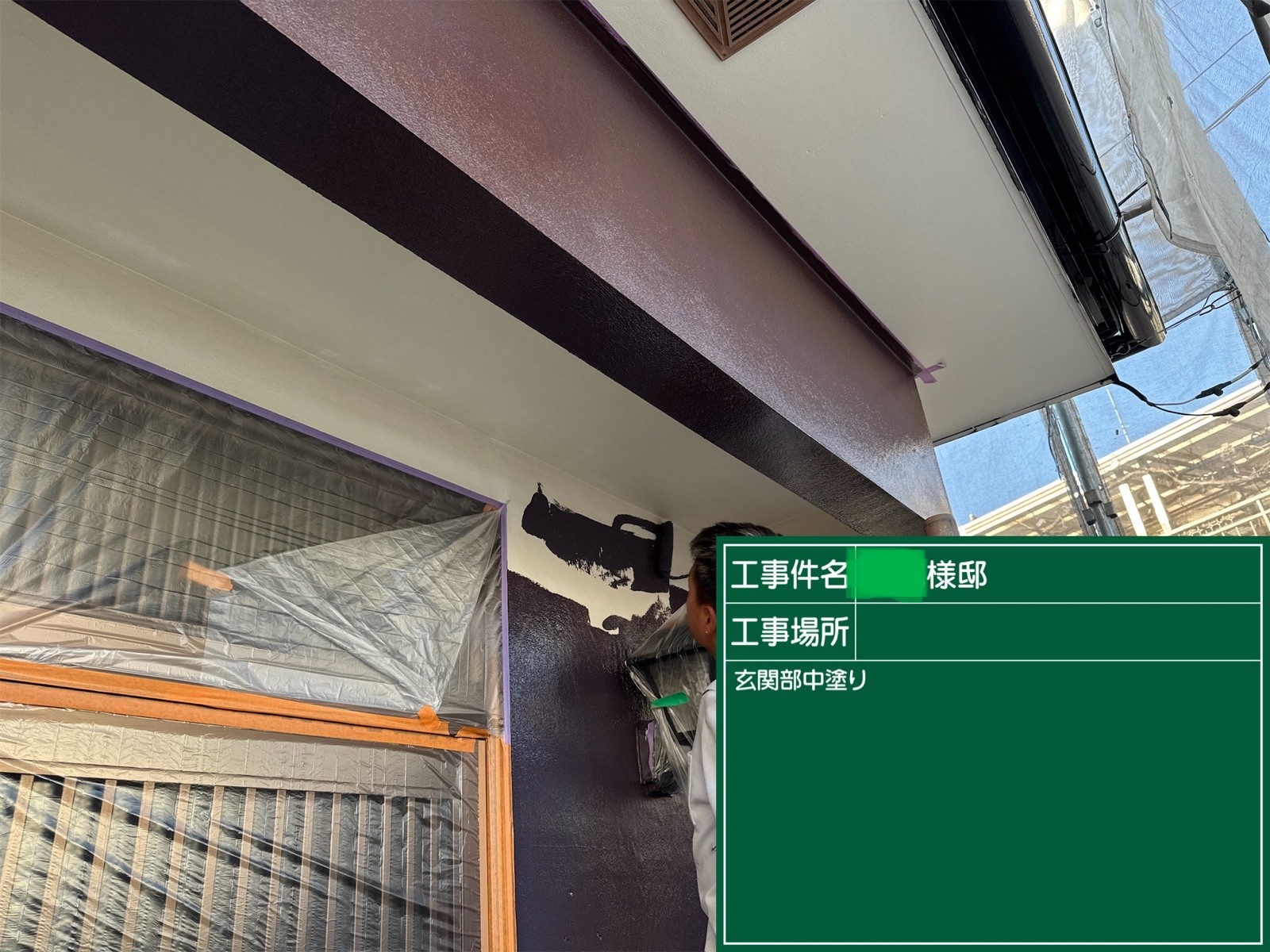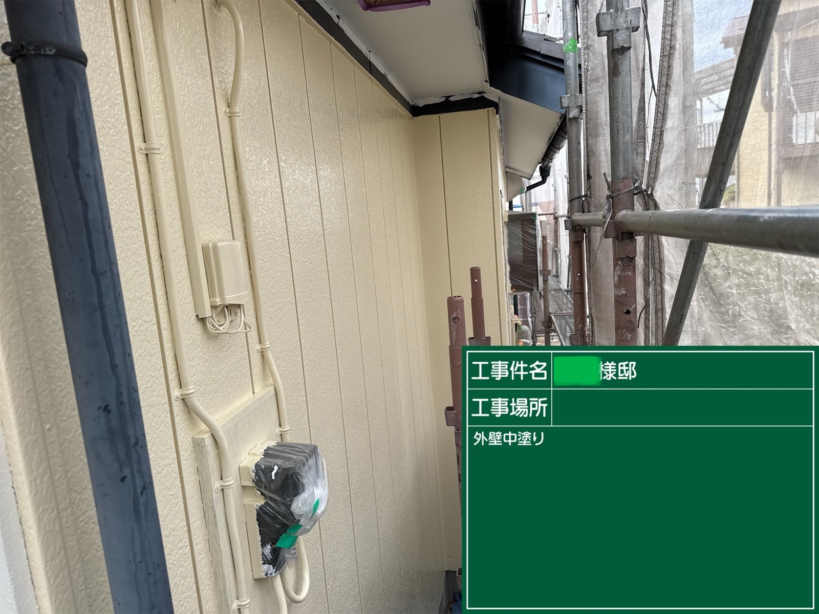 外壁の中塗りを行いました。中塗り➡上塗りと2回に分けて塗装する事で性能を耐久年数の間しっかり持続させるために中塗りの塗装が必須です。