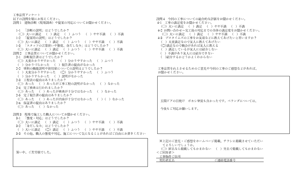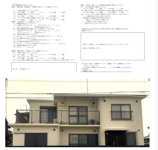 玄関ドアの日焼け ボカシ塗装も良かったです。ベランダについては、今後もご対応お願いします。
