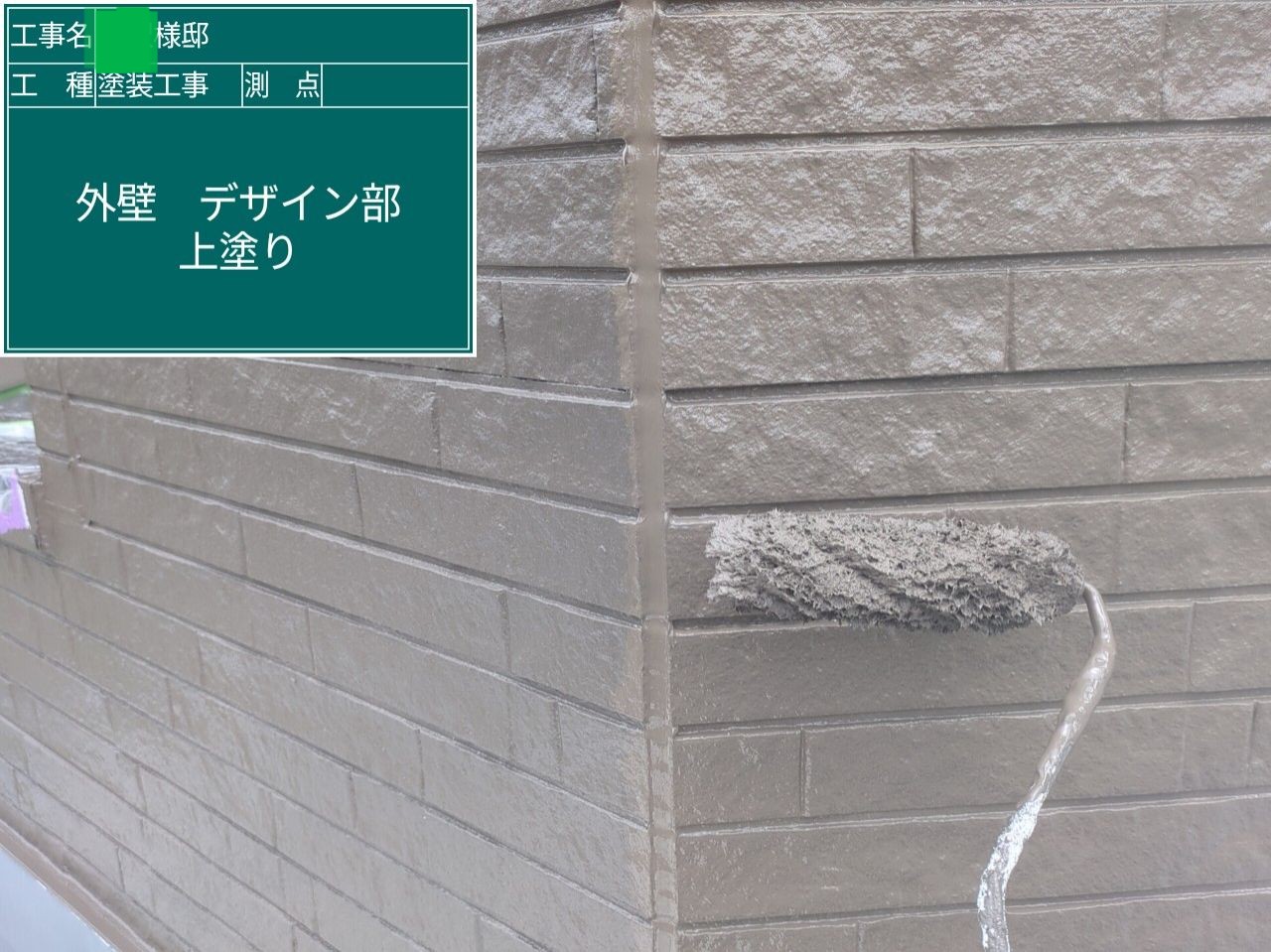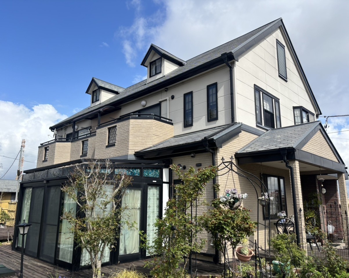 | 使用塗料 | 屋根/アステックペイント/スーパーシャネツサーモSi 外壁/アステックペイント/スーパーラジカルシリコンGH フラット部 8083(ベイジュ) 、デザイン部 8074(アイアンバーグ) |