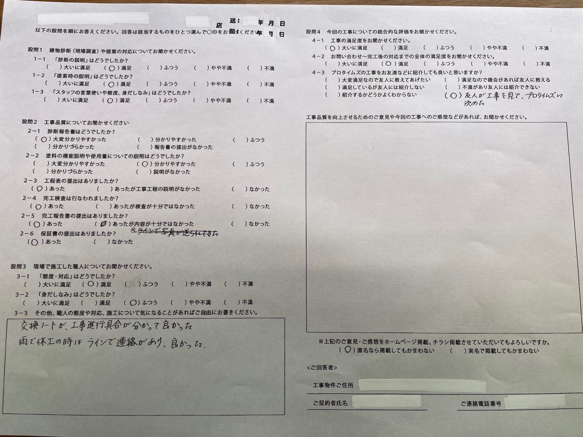 交換ノートが、工事進行具合が分かって良かった 雨で休工の時はラインで連絡があり、良かった。