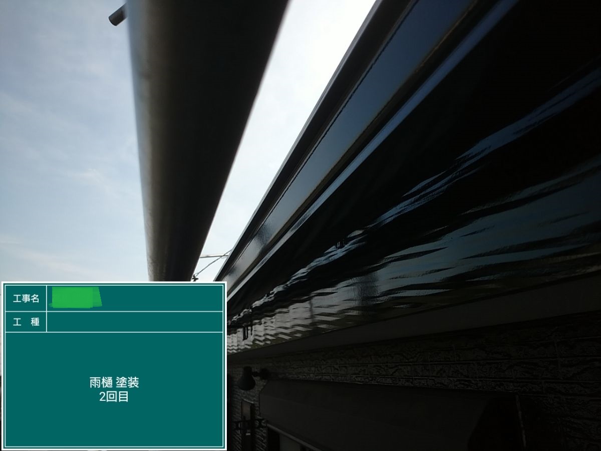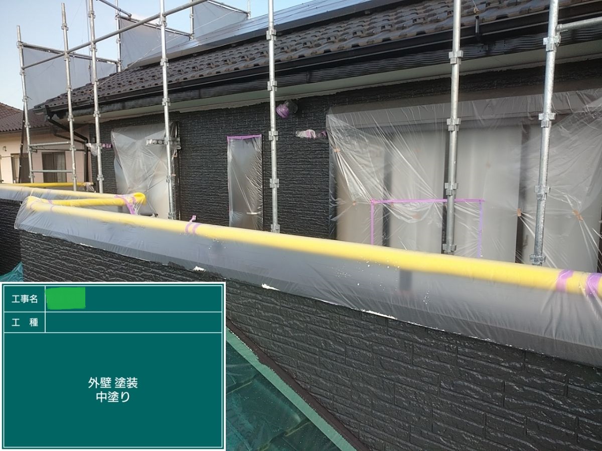 外壁中塗り施工 中塗り➡上塗りと2回に分けて塗装する事で性能を耐久年数の間しっかり持続させるために中塗りの塗装が必須です。
