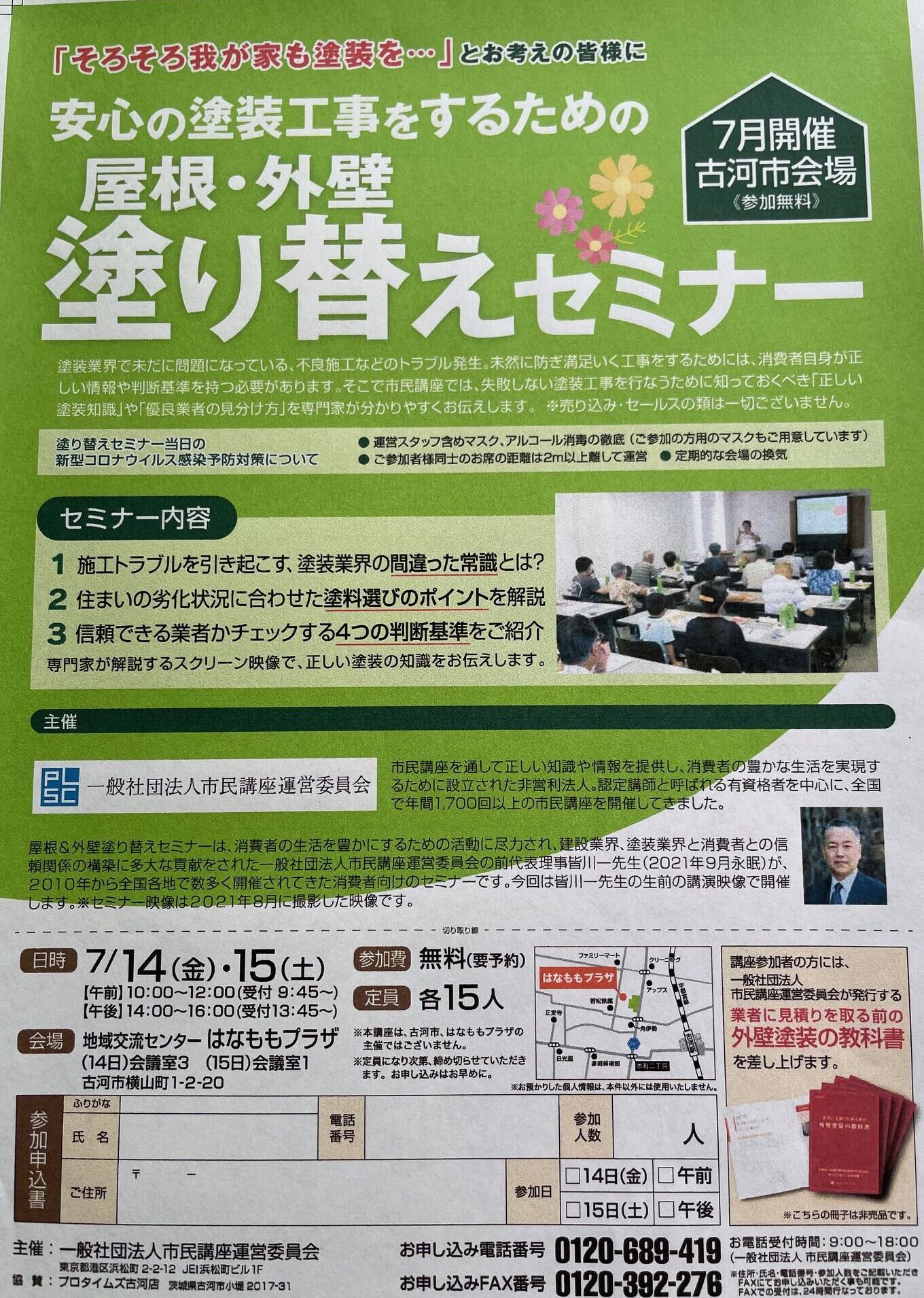 7月14日(金)15日(土)屋根・外壁塗り替えセミナーのお知らせ✐※14日(金)15(土)は中止となりました。